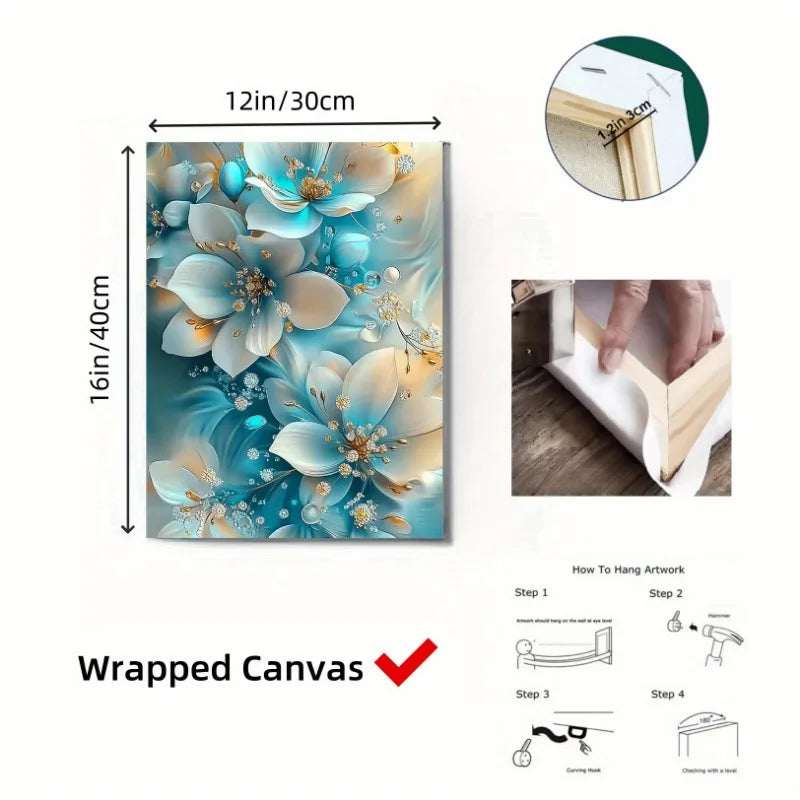 Elegant Oil Painting Artwork Framed Serene Blue and White Flowers with Gold Accents