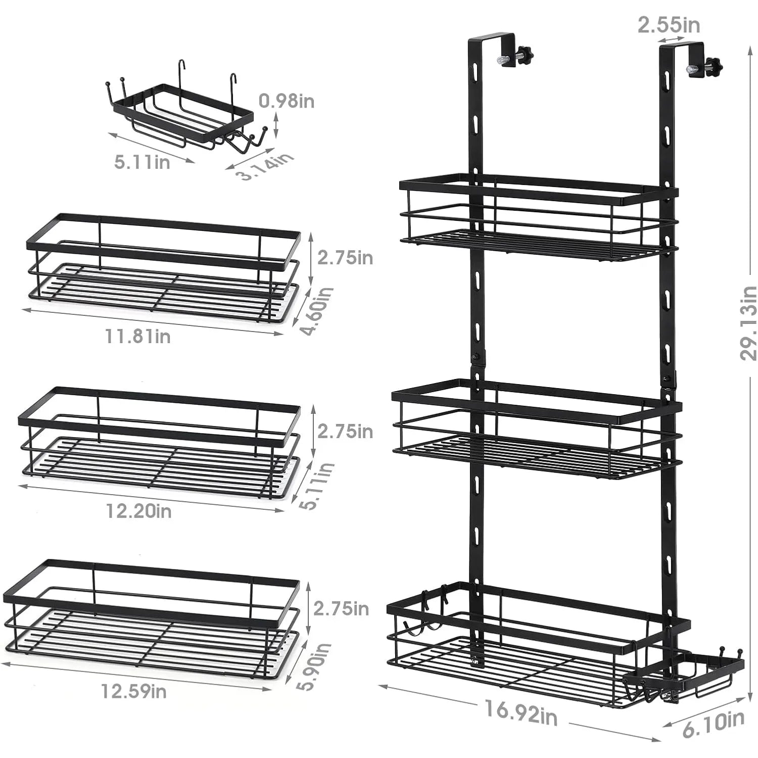 Over-Door Adjustable Rustproof Shower Caddy with Shelves & Hooks Shampoo & Soap Holder for Bathroom & Kitchen Storage - Black